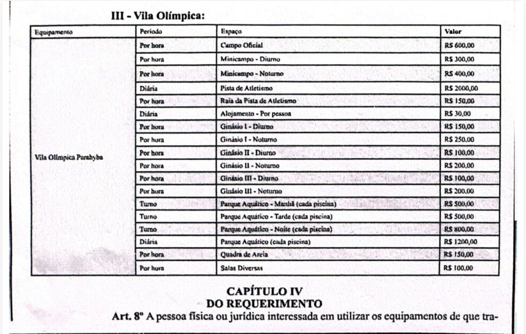 De acordo com tabela divulgada pela Secretaria de Esportes, o uso do campo oficial de futebol custa R$ 600 por hora. A diária da pista de atletismo está fixada em R$ 2 mil. Há ainda cobranças para ginásios, quadras e piscinas, com variação de preços conforme o período e o espaço. O alojamento tem diária de R$ 30 por pessoa.