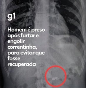 Um homem, de 20 anos, foi preso pela Polícia Militar de Minas Gerais depois de furtar uma correntinha e engoli-la para evitar que fosse recuperada. Uma radiografia identificou o objeto no estômago dele.